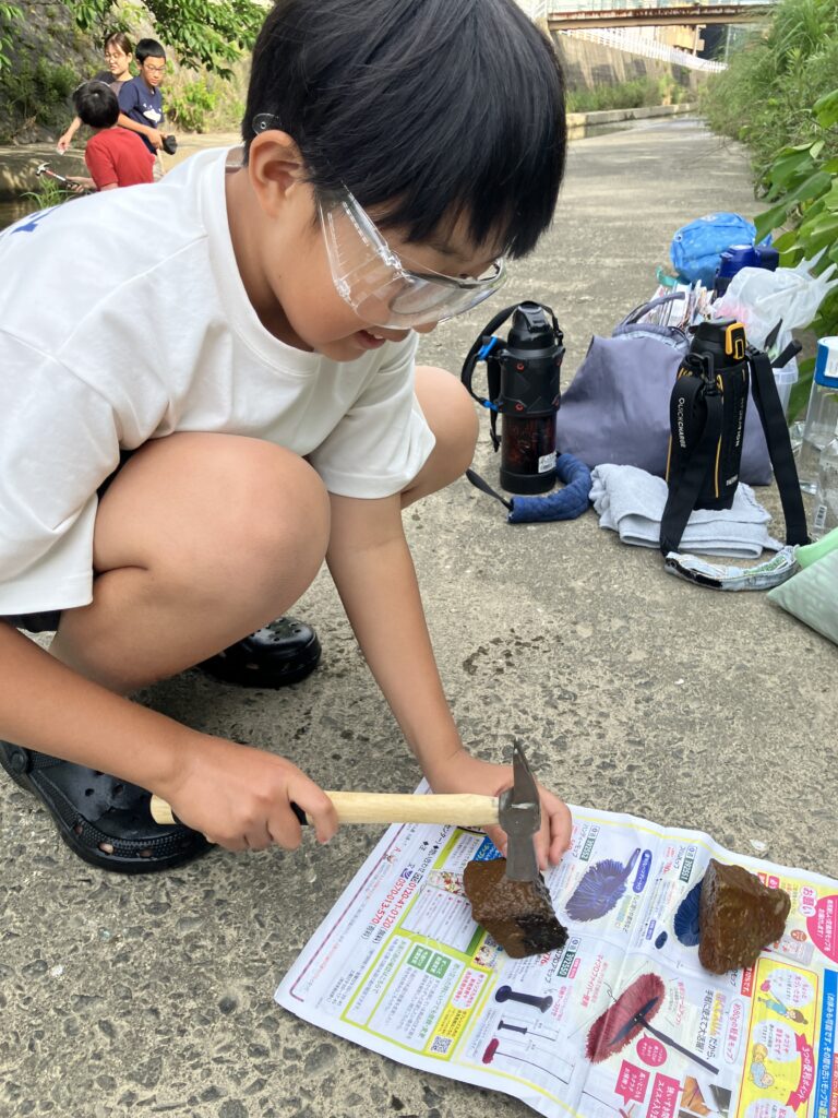 川辺の石を割ると、色や硬さ、割れ方が全く違います。キラキラ光る鉱物が出てくると、子どもたちは大興奮でした。