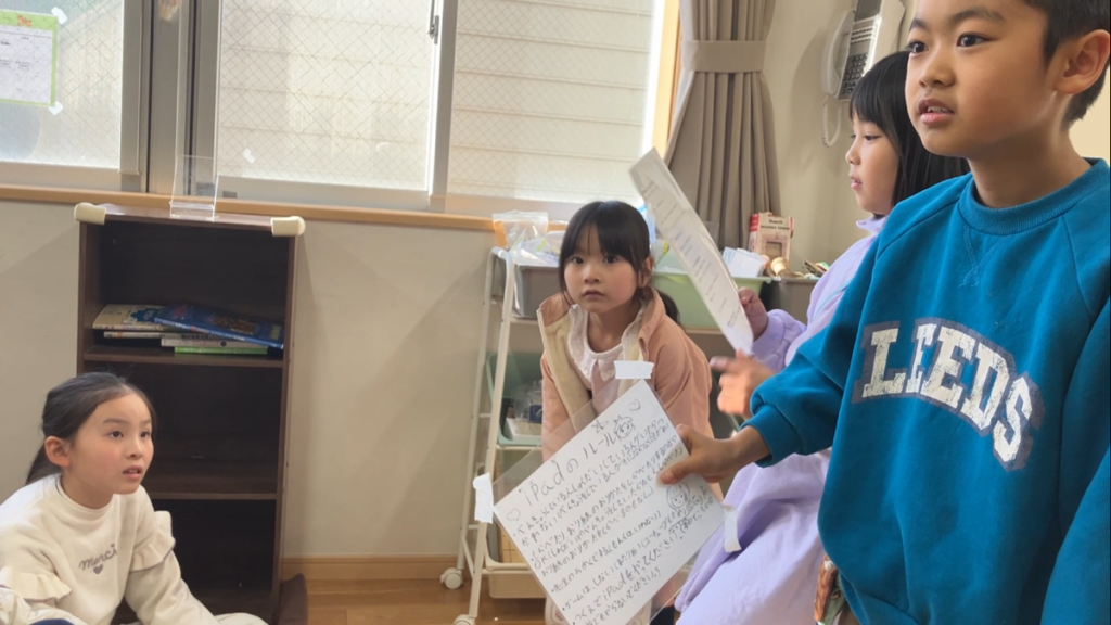 「勉強している人が気にならなくても、iPadを使っちゃいけないっていうこのルールは、おかしいと思います。だから、ルールを変えたいです。」