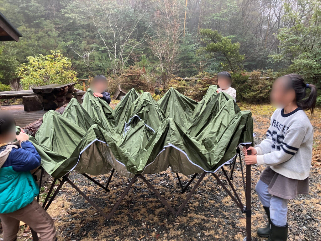 雨の中でも活動できるよう、声をかけあいながらテントを立てたり、夕食のカレーづくりにむけて食材の下ごしらえをしたり、ふだんの生活から離れた環境だからこそ生まれる協働、そしてゆるりとつながる一体感がありました。