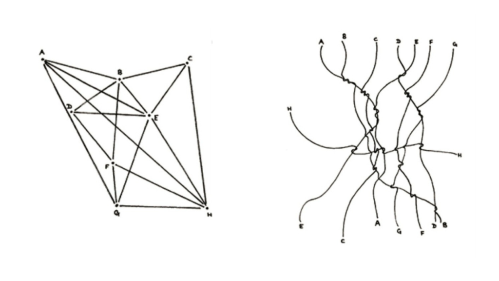 メッシュワークとは、文化人類学者ティム・インゴルドが提起した「生き方」についての概念です。点と点を最短距離でつなぐ「ネットワーク」構造に対し、メッシュワークは、歩くように伸びていく線どうしがからまりあうことで生まれる網構造になっています。