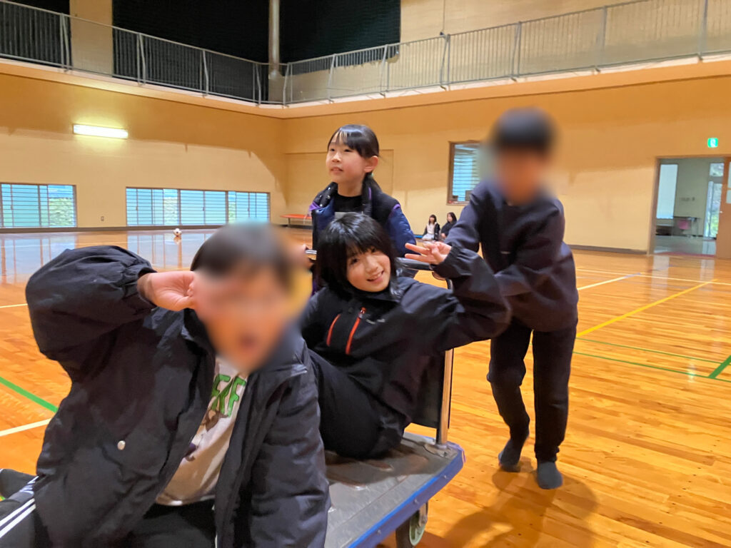ボールやバドミントンは用意していましたが、子どもたちの遊びは大人の想像を軽々とこえていきます。体育館で使わせてもらえることになった備品の台車で人を載せて運ぶ遊びが始まりました。