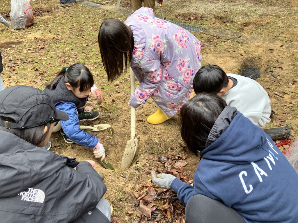 子どもたちはというと、穴をほる作業に没頭する子、炭を入れる子、落ち葉を入れる子など、それぞれが自分のやりたい参加の仕方で植樹を楽しんでいました。