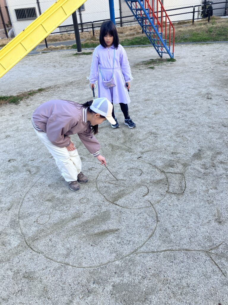 普段CAN!Pアフタースクールで遊んでいる園庭は人工芝なので、実は「土の地面に絵を描く」というのはとても新鮮な体験です。