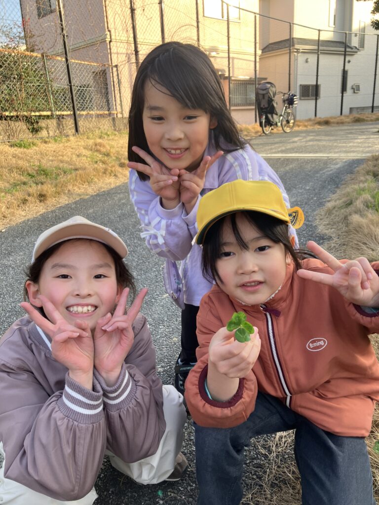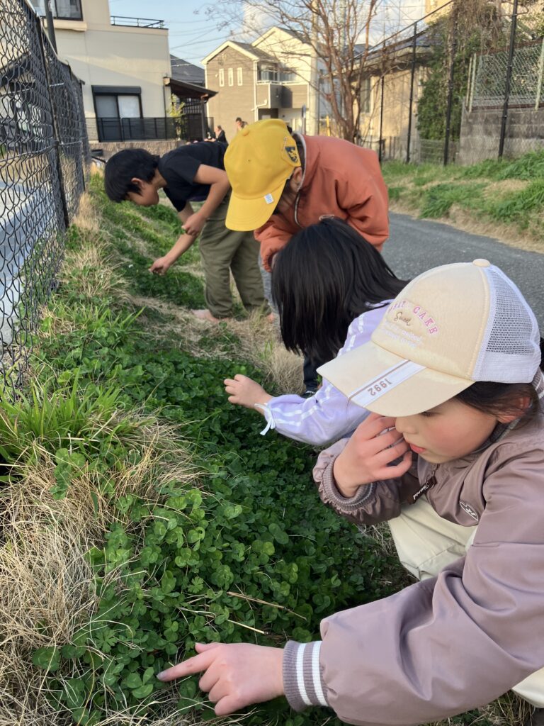 そしてとても面白かったのが、遊びの移り変わりです。 鬼ごっこの最中、足元にクローバー畑を見つけた子が「四つ葉あるかな?」と探し始めました。