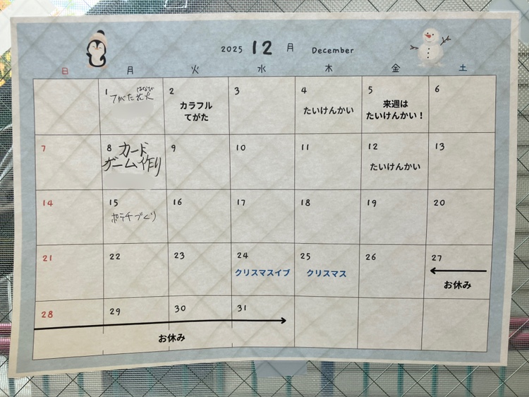 子どもたちが「これやりたい!」と思ったことを、自由に書き込めるカレンダーです。書き込んだ企画は、スタッフが一緒に実現方法を考えます。「書いたら叶う」という実感が、子どもたちの積極性を引き出しています。