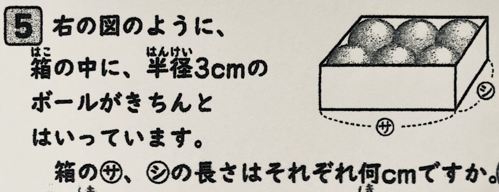 どうしてその式にしたのか聞いてみると、半径が3㎝だから直径は6㎝、そして箱の中にはボールが横に3つ並んでいるので「6×3=18」と考えた、とのことでした。