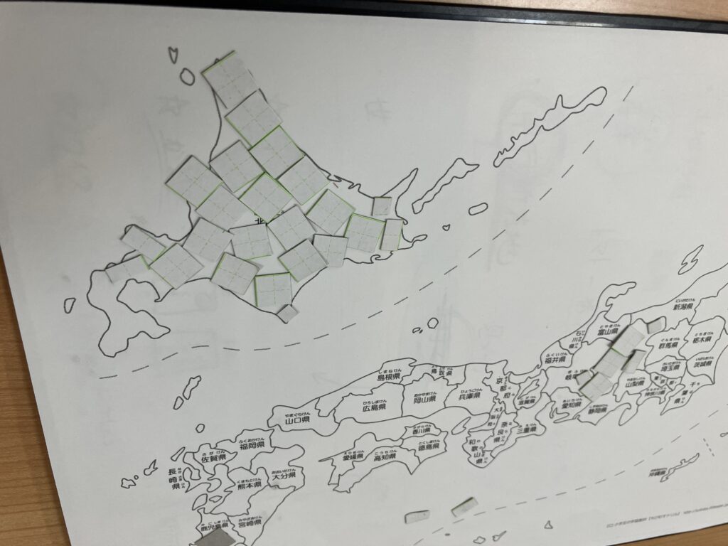 しかし、この方法だとまだ困ったことがありました。それは、1cm四方の紙では大きすぎて、県の形に合わせて隙間を埋められないことです。