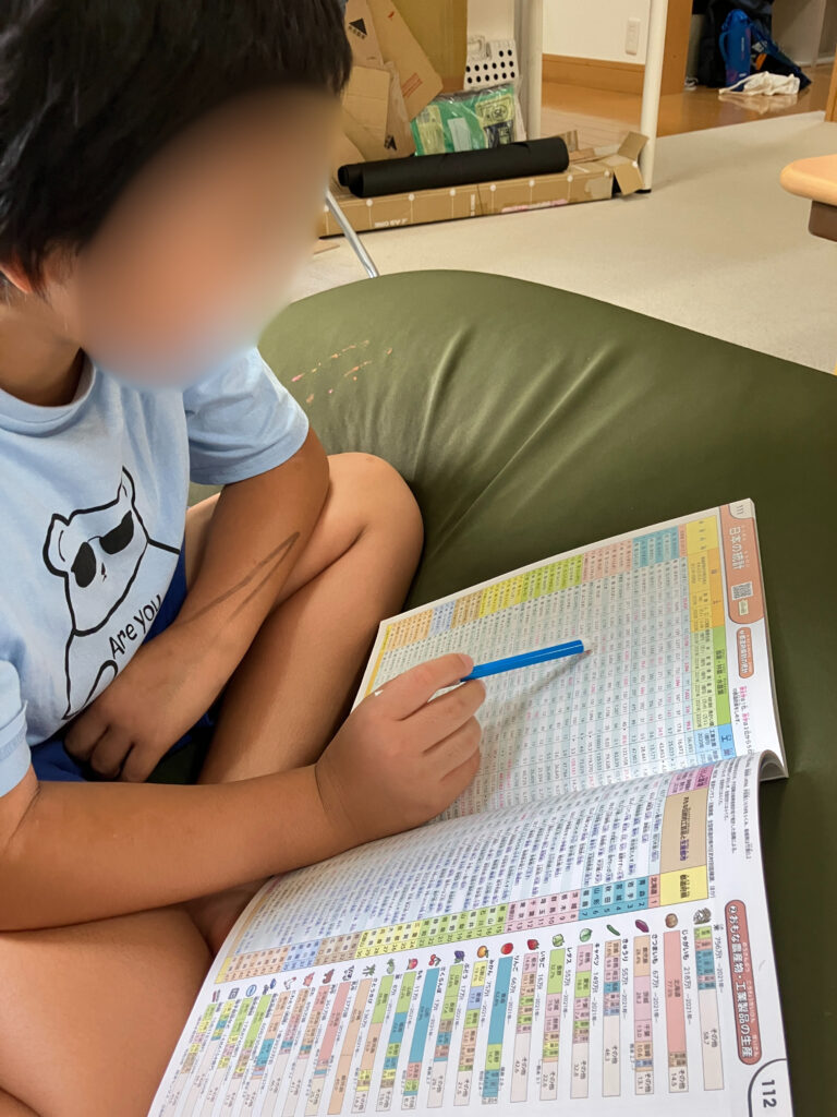 簡単に地図帳の見方を教えると、ある男の子が地図帳を食い入るように見始めました。彼が読んでいたのは各県の統計のページです。